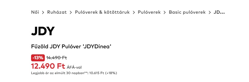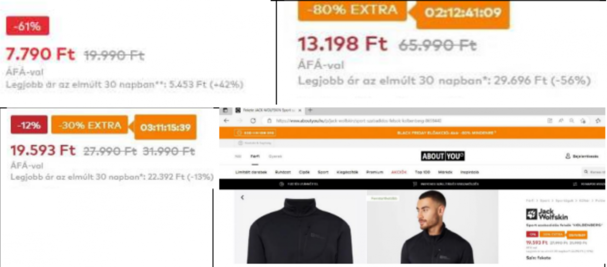 A lenti ábra bal felső sarkában például az látszik, hogy egy eredetileg 19 990 forintért árult terméket 7 790 forintért kínálnak, és ezt 61 százalékos akcióként kommunikálják. Ugyanakkor az apró betűs szürke részből kiderül, hogy ugyanezt a terméket a megelőző 30 napban 5 453 forintért is árulták, amihez képest 42 százalékos áremelkedés történt.