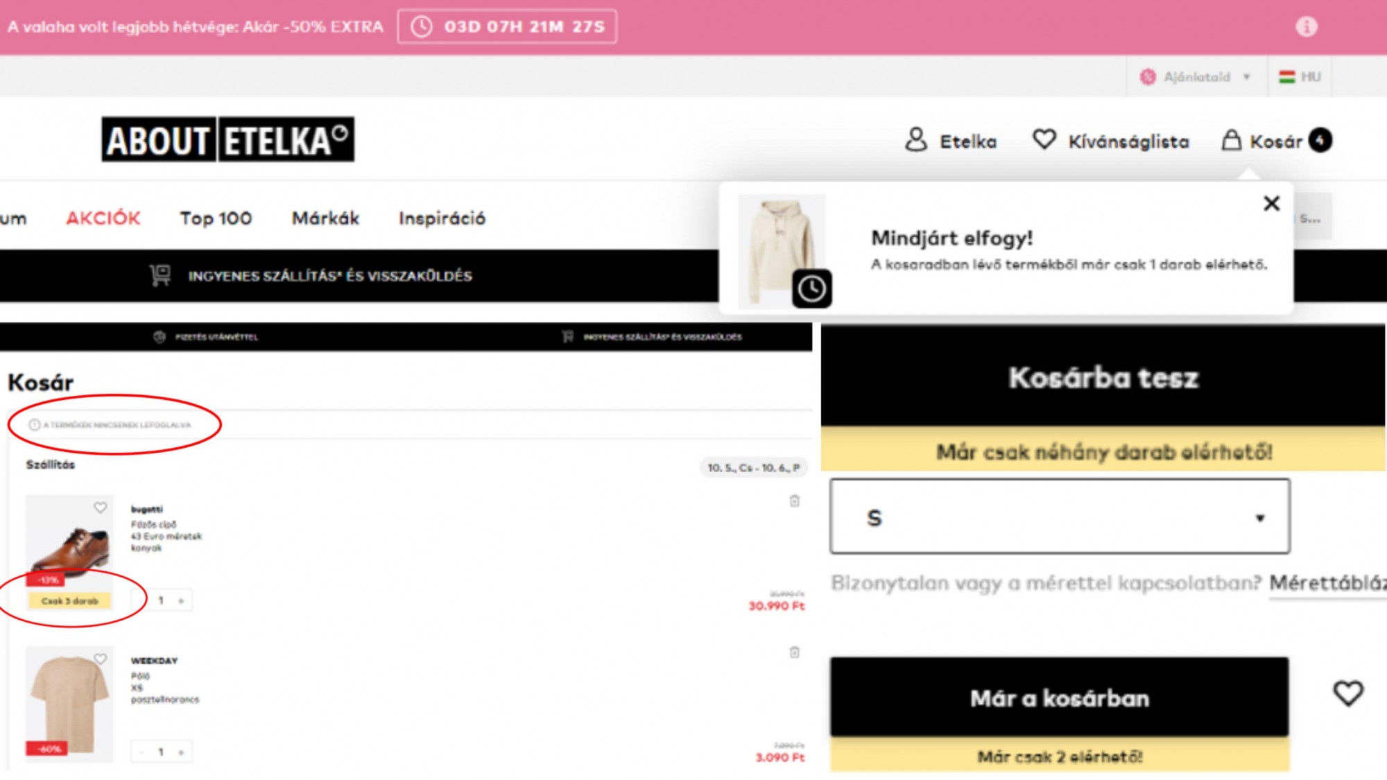 Ezt az elemet (különösen, ha másodpercre pontosan mutatja az időt, mint ahogy az About You oldalán is történt), továbbá a korlátozott készlet kiemelését az online marketingben tudatosan a vásárlásra buzdításra és a FOMO-érzés kialakítására használják. A másodpercekben mért idő folyamatos „pergése” pszichés nyomást gyakorol a fogyasztókra, sürgetőleg hat rájuk. A termékadatlapon ráadásul ezt az információt közvetlenül a kampánykedvezmény mellett, színes háttérrel emelik ki, így mindenképpen megragadja a fogyasztók figyelmét.
