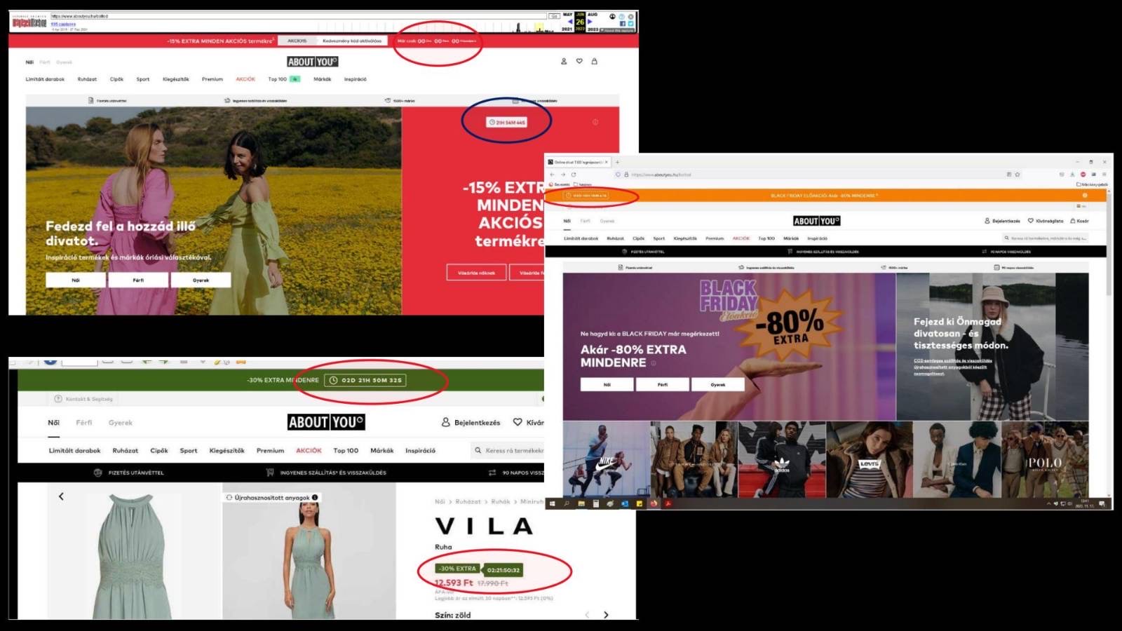 - Továbbá az About You a GVH szerint pszichés nyomást gyakorolt a vásárlókra az akciós kampányokból hátralévő időt mutató visszaszámláló órákkal, és azzal, hogy a termékek korlátozott elérhetőségéről mutattak be üzeneteket a felhasználóknak.