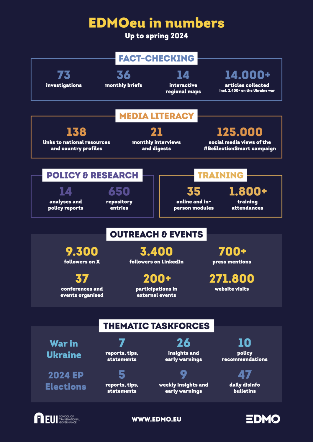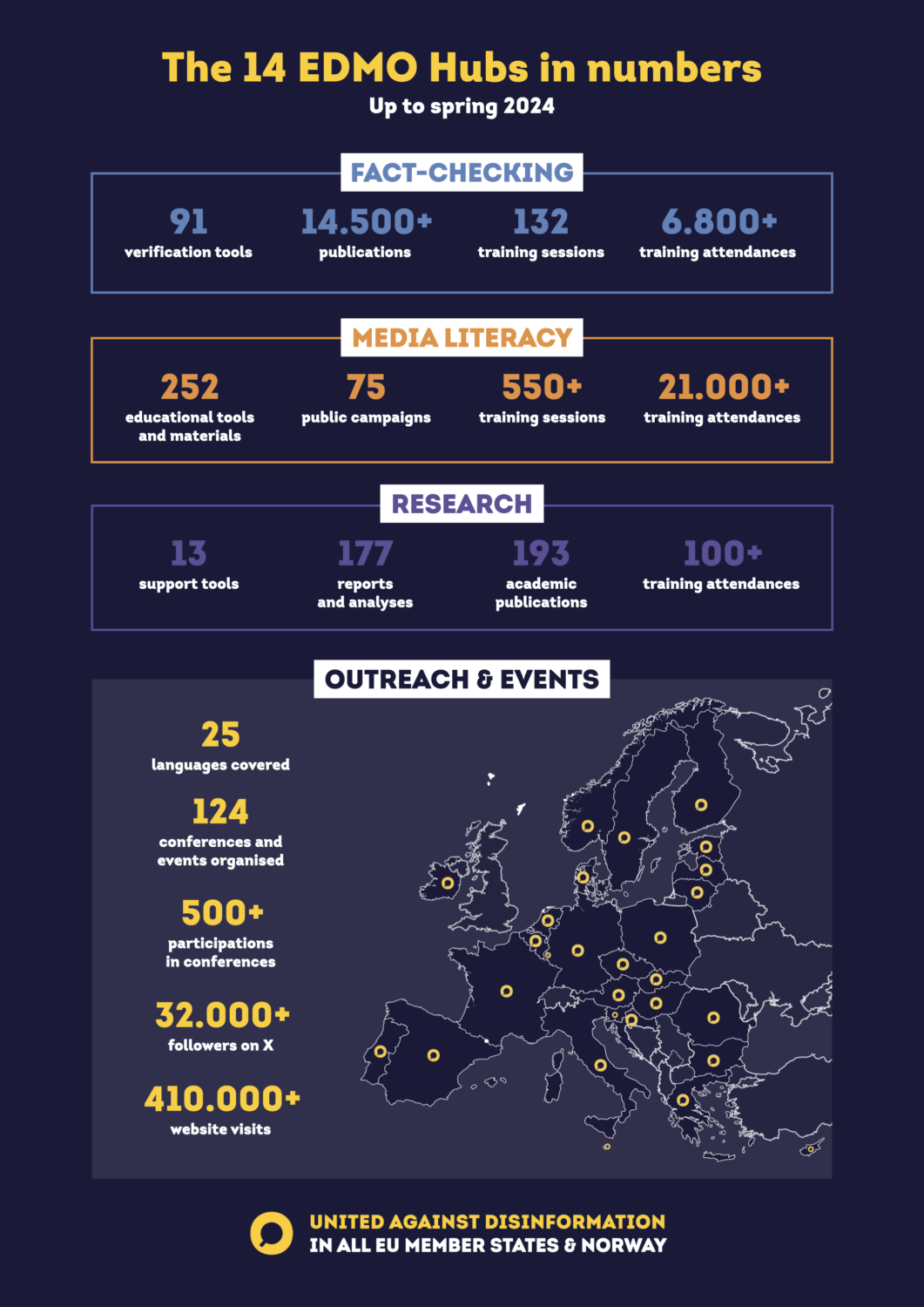 The selection of figures below provides an overview of what our network has so far accomplished in its core areas of activity. As we look towards the next chapter of EDMO, these numbers also serve as an inspiring visualization of what this relatively young network can achieve, and why it is critically important that it continues its work.