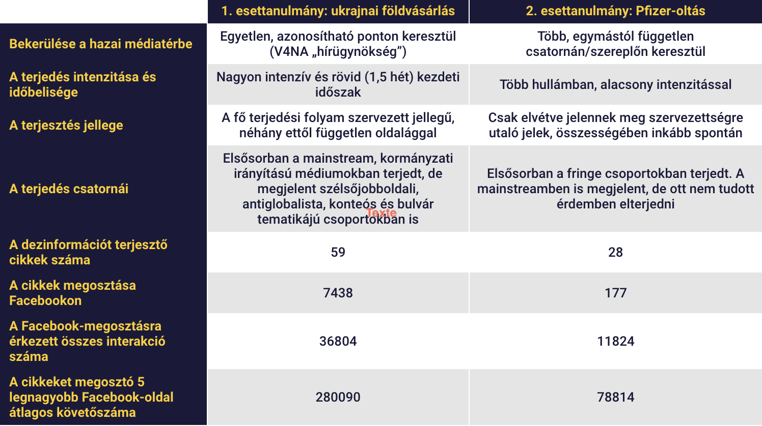 Tanulmányunk két dezinformáció alakulását mutatja be, és azok terjedését járja körül. Az első, ukrajnai háborúval kapcsolatos esettanulmány arról szól, hogy az amerikai vállalatok Ukrajna földjeinek jelentős részét felvásárolták, mintegy gyarmatosítva az országot, a második pedig azzal kapcsolatos, hogy a Pfizer-oltást egyfajta „emberkísérletként” használták.