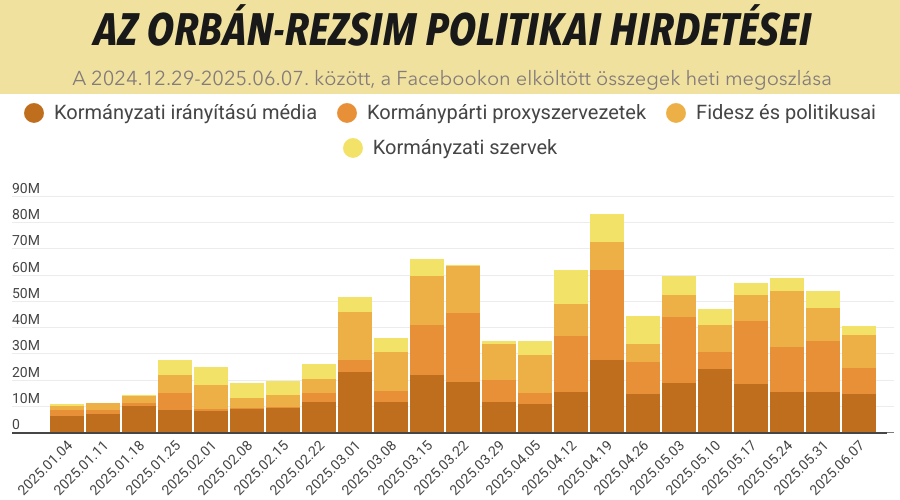 - Az összes költés 82%-ának cechjét az Orbán-rezsim szereplői állták. A kormányzati irányítású média idén eddig 328 milliót, a kormányzati proxyszervezetek 255 milliót, a Fidesz pártszervezetei és politikusai 240 milliót, a kormányzati szervek pedig 122 milliót költöttek.